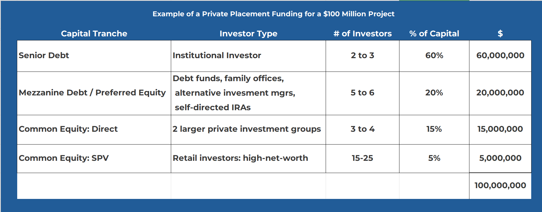 Private placements can fund various organizational levels, such as the operating company, project, portfolio, or investment fund. Perhaps the sponsor needs project finance to renovate an old shopping mall. If they’ve already found debt financiers, they may wish to issue preferred equity to round out the capital raise. Or, rather than project financing, they may have decided to acquire a portfolio of assets and require financing` this at the corporate level.